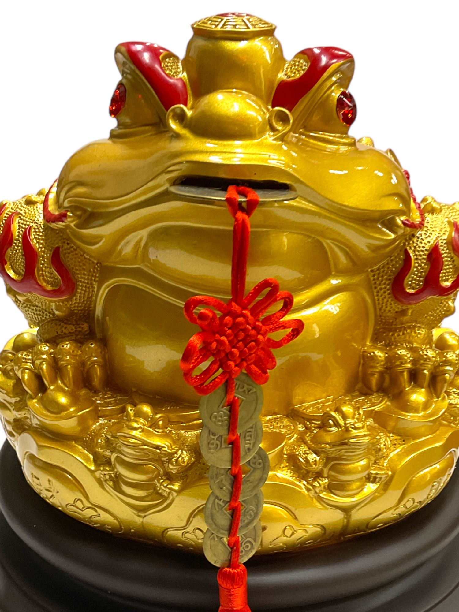 A good luck golden frog statue is a symbol of wealth and prosperity in Feng Shui. It is believed that the frog produces gold and silver from its mouth and brings good fortune to the owner. The coin represents the money that the frog brings, and the red ribbon represents the activation of its energy. A good luck golden frog statue can also have other spiritual benefits, such as protecting the house from negative energies, enhancing the harmony and happiness of the family, and increasing the creativity and productivity of the owner. The frog is a symbol of transformation and renewal, and can help the owner overcome obstacles and achieve their goals.